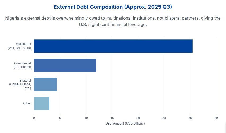 While Nigeria has political motivation to pivot East, the economic reality is that a clean break from Western-aligned institutions is impossible. Nigeria is deeply reliant on multilateral debt, which is largely controlled by the U.S. and its allies.