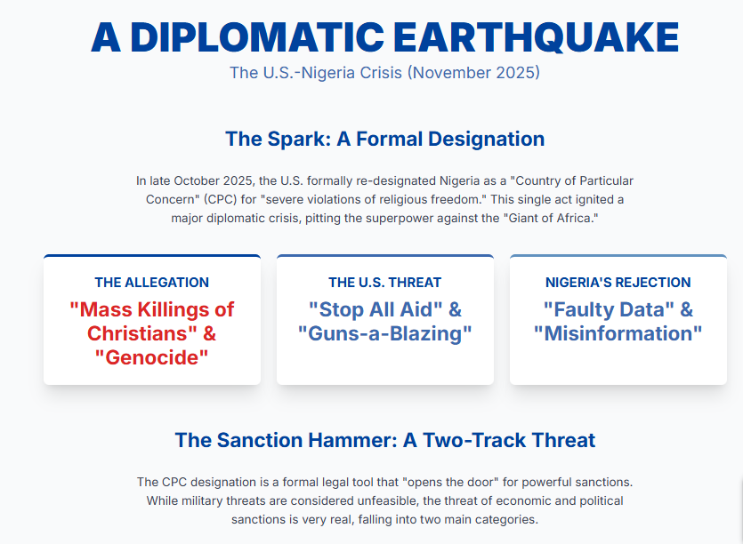 The event was the formal re-designation of Nigeria by the United States as a “Country of Particular Concern” (CPC) for “severe violations of religious freedom.” This move, driven by U.S. political pressure and allegations of “mass killings of Christians” and “genocide,” was met with an immediate and forceful rejection from the Nigerian government, which labeled the designation as based on “faulty data” and a dangerous “misinformation” of its complex security challenges.