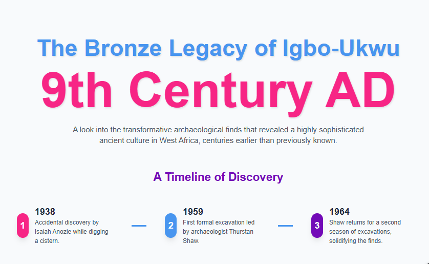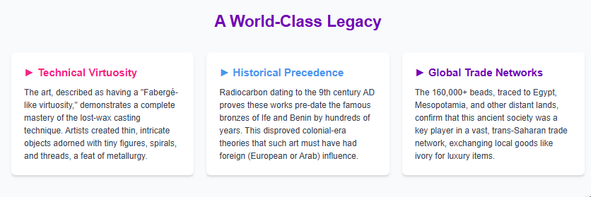 The 9th-Century Date: Radiocarbon dating confirmed that the sites date to around the 9th century AD, pre-dating the celebrated bronzes of Ife and Benin by several hundred years. This revelation was critical, as it decisively disproved the colonial-era speculation that such advanced artistic techniques must have been introduced by later European or Arab contact. Igbo-Ukwu proved that indigenous African cultures independently developed sophisticated bronze-casting traditions in the Lower Niger region.