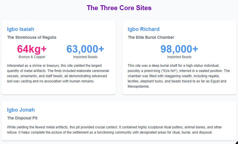 In summary, the three sites of Igbo Isaiah, Igbo Richard, and Igbo Jonah collectively paint a vivid portrait of a highly developed, wealthy, and ritually complex society flourishing in West Africa during the early medieval period. They stand as a towering testament to the artistic genius and economic reach of the ancient Igbo civilization.