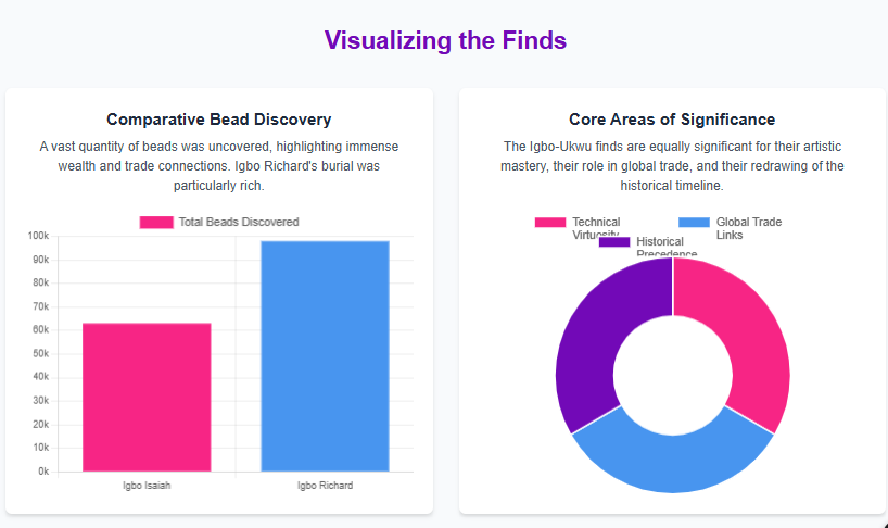 Implications for African Trade: The massive quantity of glass and carnelian beads, sourced from as far as the Middle East, confirms Igbo-Ukwu’s deep integration into a vast, intercontinental trade system. This trade was not necessarily direct but was likely facilitated through extensive interregional networks across the Sahara and down the Niger River, with the Igbo-Ukwu people trading valuable local goods—possibly ivory, spices, or slaves—for luxury items like beads and copper ingots.